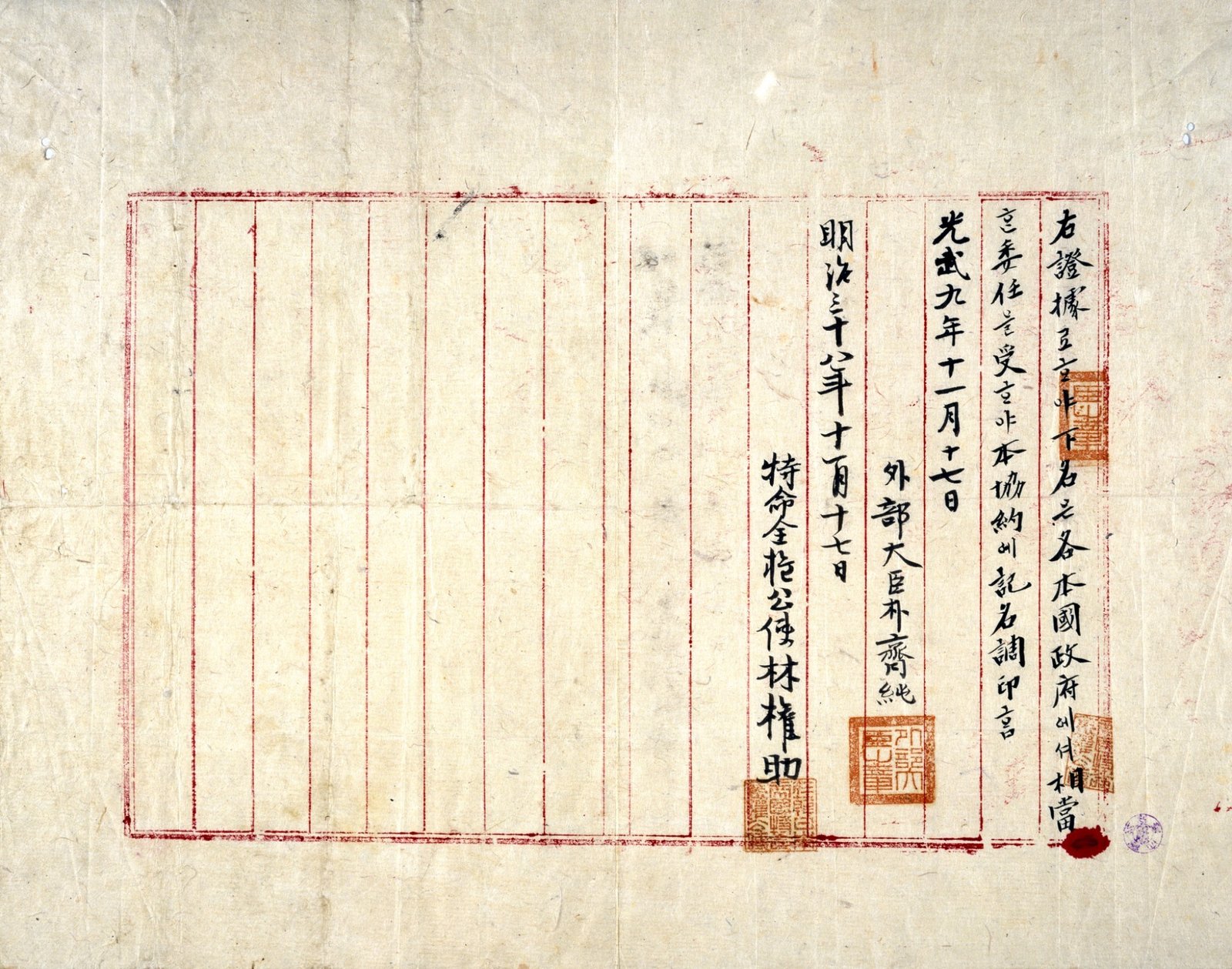 On November 17, 1905, the Korean Empire suffered a fatal blow to its status as an independent nation. Officially known as the Second Japan-Korea Agreement, the Eulsa Treaty deprived Korea of its diplomatic sovereignty and established a Japanese Resident-General in Seoul. This effectively reduced the Korean Empire to a protectorate of Japan.