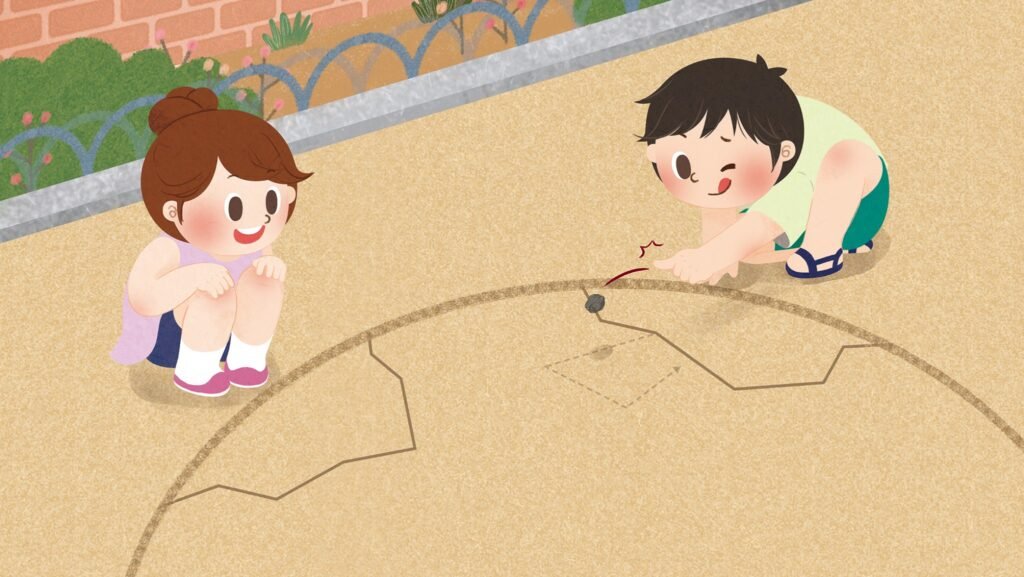- Bom-deul-gi (Hole In): Dig small holes in the ground. You must flick your marble into each hole in sequence.