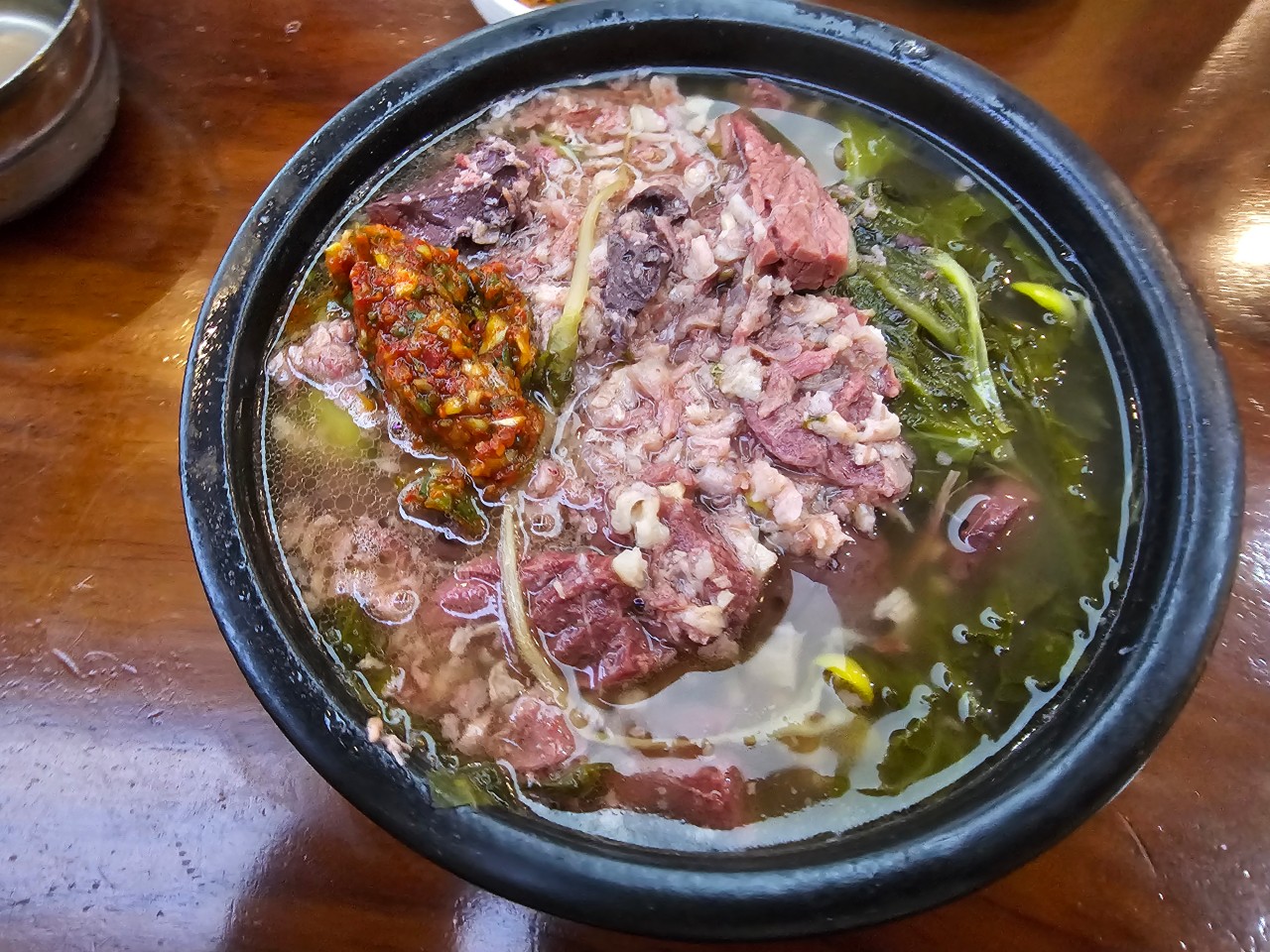 Situated in the bustling corporate hub of Samseong-dong (์ผ์ฑ๋), this premium spot is the holy grail for Gangnam office workers. Originally founded by a meat distribution company, the quality of their beef tripe and blood is unmatched. Their spicy broth, lightly drizzled with chili oil, draws massive crowds, so be prepared to use a digital queuing app if you visit during peak lunch hours.