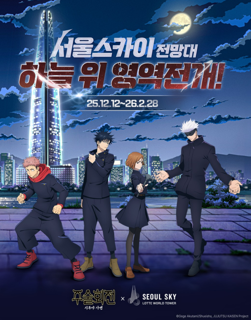 Seoul Sky Observatory and Jujutsu Kaisen have collaborated to create an extraordinary popup store experience! Witness iconic scenes from the anime brought to life in a breathtaking space. We invite you to expand your domain and explore the enchanting world of Jujutsu high above the city at Seoul Sky. Follow @seoulsky_official on Instagram for more updates.