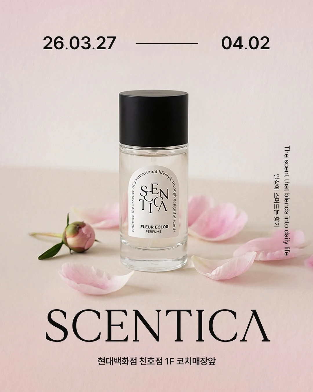 Discover your perfect scent at the Scentica Pop-up in Hyundai Department Store Cheonho! Explore a variety of fragrances and find the one that truly resonates with you. Located on the 1st floor in front of the Coach store, this pop-up offers a unique olfactory experience in a relaxing, nature-inspired setting.
