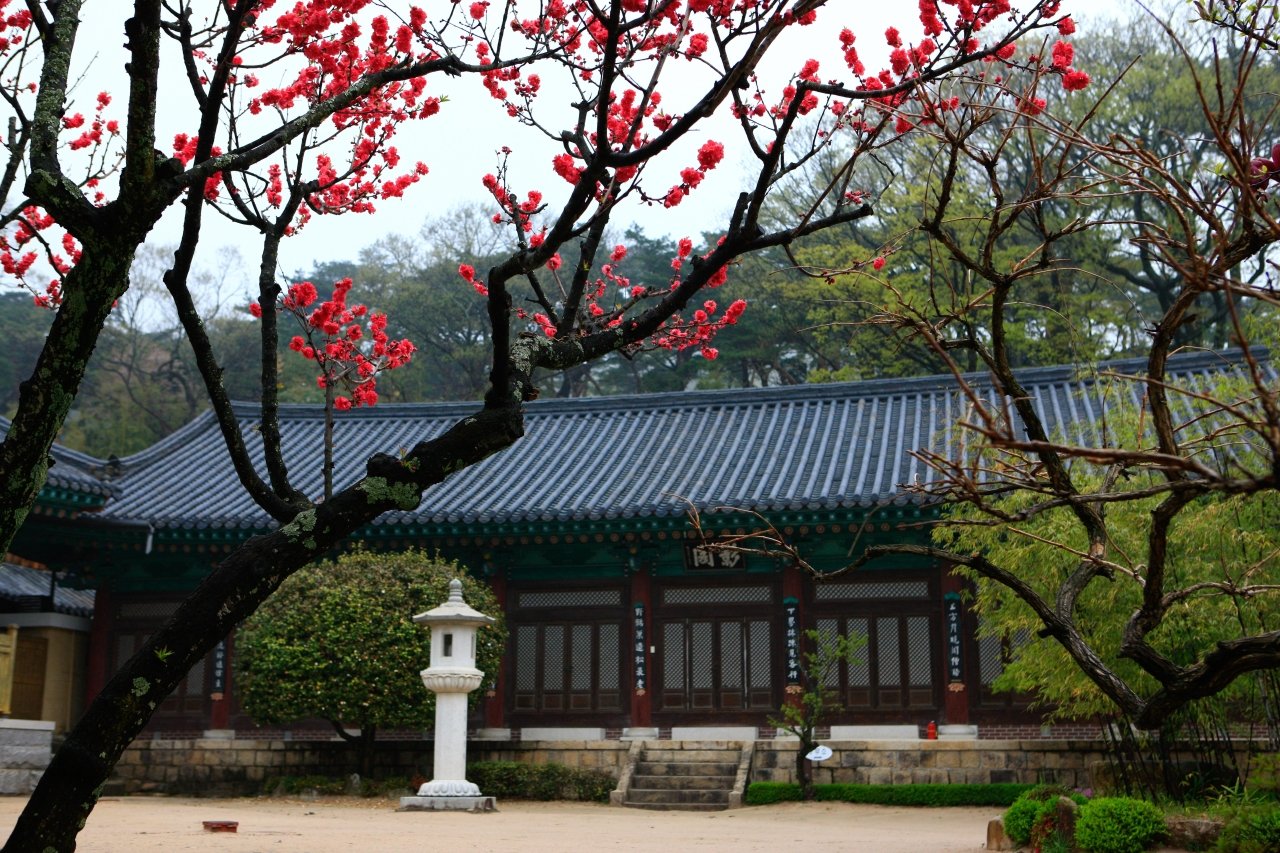 - The Highlight: The legendary Heukmae (Dark Red Plum) tree next to Gakhwangjeon Hall. It usually blooms a bit later than other varieties (Mid to Late March).
