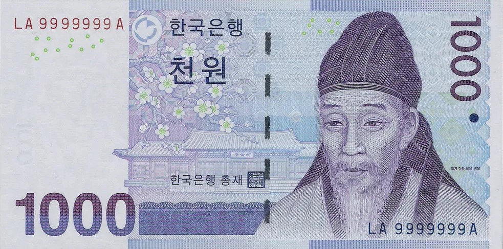 The 5,000 won note holds a very special place in global currency design because it creates a familial link with the 50,000 won note. The front features the great philosopher Yulgok Yi I, while the back features the artwork of his mother, Shin Saimdang. Having a mother and son featured on a nation’s currency is a remarkably rare and beautiful tribute.