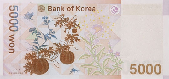 | 5,000 Won | Yulgok Yi I | Chochungdo (Watermelon & Cockscomb) | Shin Saimdang |