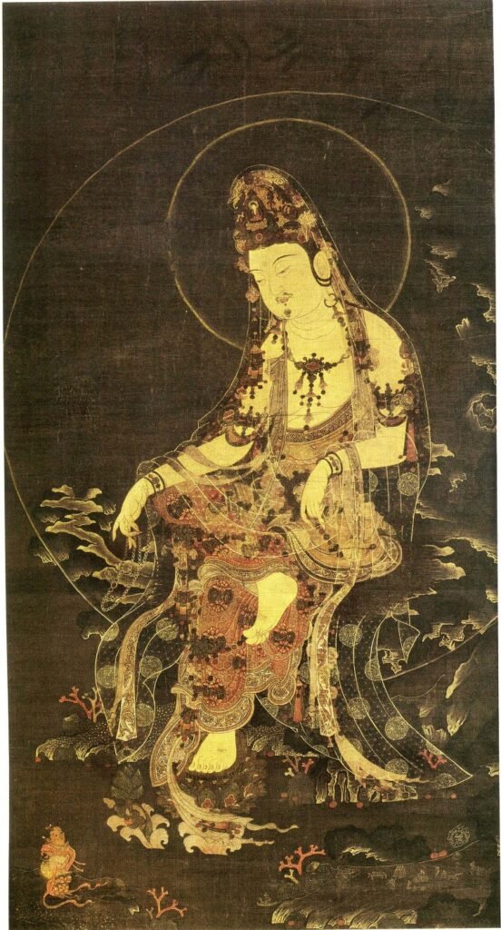 The masterpiece of this era is the Suwol Gwaneumdo (Water-Moon Avalokitesvara). What makes Goryeo art so special is the “reverse painting” technique—applying colors to the back of the silk to create a soft, glowing effect. When you see a high-quality Goryeo Buddhist painting, the transparent veil of the Bodhisattva looks so real it’s hard to believe it was painted over 700 years ago.