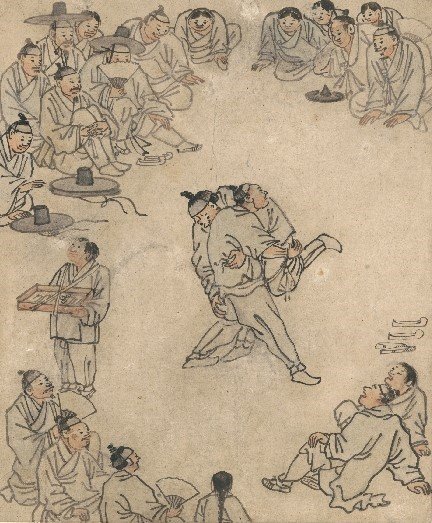 Kim Hong-do (Danwon) is arguably the most beloved painter in Korean history. While he was a genius at royal portraits, his true legacy lies in Pungsokhwa. His Ssireum (Korean Wrestling) captures the sweat, humor, and joy of a village festival. He wasn’t alone, though. His contemporary Shin Yun-bok (Hyewon) focused on the “leisure” side of Joseon—the romance and parties of the upper class—using delicate lines and vibrant colors.